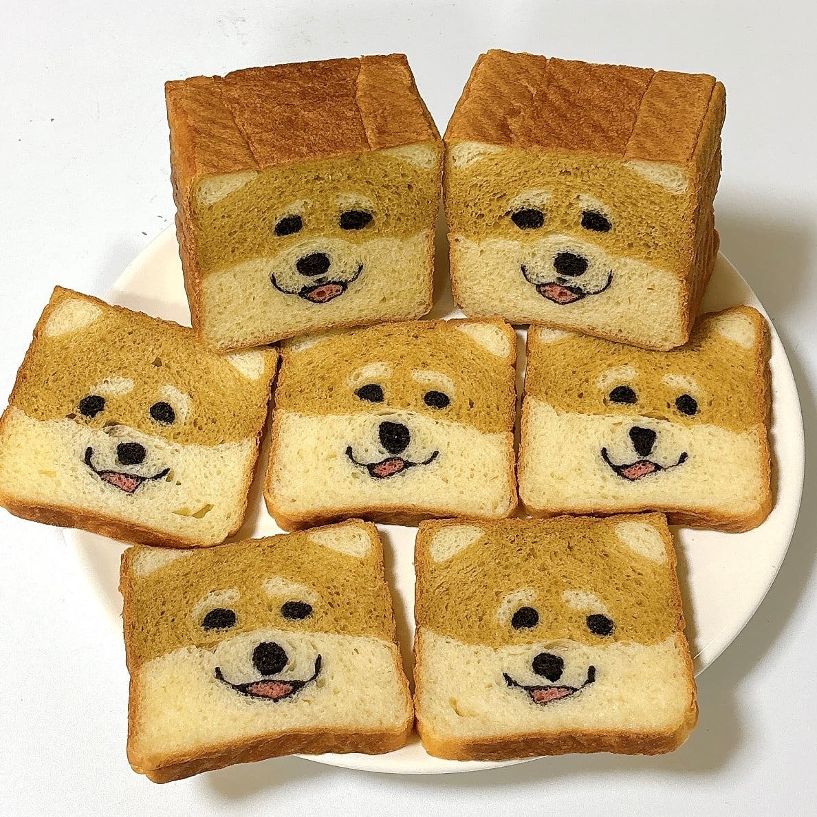 ◎断面に柴犬の図柄の食パンです。金太郎飴のような手法で一つずつ手作りしています。 それぞれ多少図柄が異なりますがご了承いただければ幸いです。